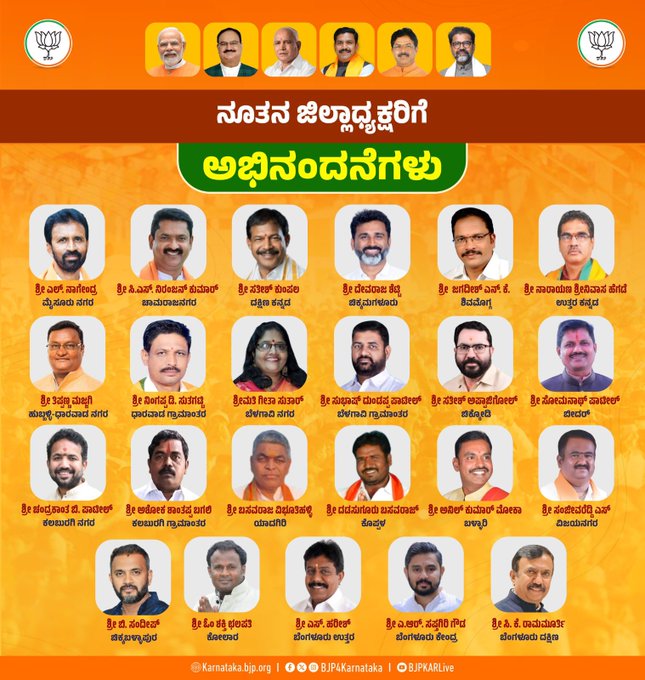 ಕರ್ನಾಟಕ ರಾಜ್ಯದ 23 ಜಿಲ್ಲೆಗಳಿಗೆ ನೂತನ ಜಿಲ್ಲಾಧ್ಯಕ್ಷರನ್ನು ಆಯ್ಕೆ ಮಾಡಿ ಬಿಜೆಪಿ ಪಟ್ಟಿ ಬಿಡುಗಡೆ ಮಾಡಿದೆ.