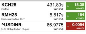 Date 13-2-2025 Coffee closing London Mar 5817+164 may 5821+158 Nybot mar 4,31.80+18.35 may 420.30+15.80...
