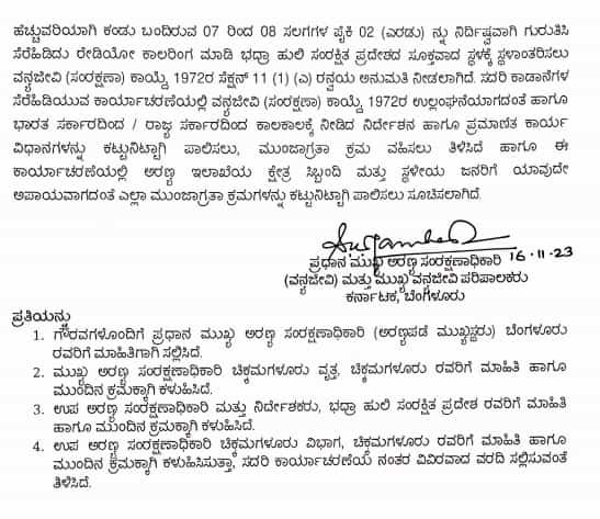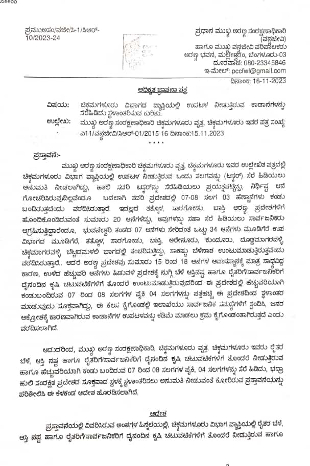 ಚಿಕ್ಕಮಗಳೂರು ಮುಖ್ಯ ಅರಣ್ಯ ಸಂರಕ್ಷಣಾಧಿಕಾರಿಗಳು ಇವರು ಸಲ್ಲಿಸಿದ್ದ ಪ್ರಸ್ತಾವನೆಯಂತೆ ಹೆಚ್ಚುವರಿಯಾಗಿ ಕಂಡು ಬಂದಿರುವ 7 ರಿಂದ 8 ಸಲಗಗಳ ಪೈಕಿ 4 ಸಲಗಗಳನ್ನು ಹಿಡಿದು ಬೇರೆಡೆಗೆ ಸಾಗಿಸಲು ಅನುಮತಿ ಕೋರಿದ್ದರು. ಈ ಪ್ರಸ್ತಾವನೆಯ ಮೇರೆಗೆ 2 ಸಲಗಗಳನ್ನು ಹಿಡಿಯಲು ಪ್ರಧಾನ ಮುಖ್ಯ ಅರಣ್ಯ ಸಂರಕ್ಷಣಾಧಿಕಾರಿಗಳು, ವನ್ಯಜೀವಿ ವಿಭಾಗ ಬೆಂಗಳೂರು ಇವರು ಆದೇಶ ಮಾಡಿರುತ್ತಾರೆ.
