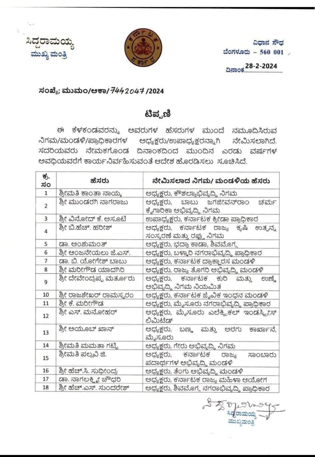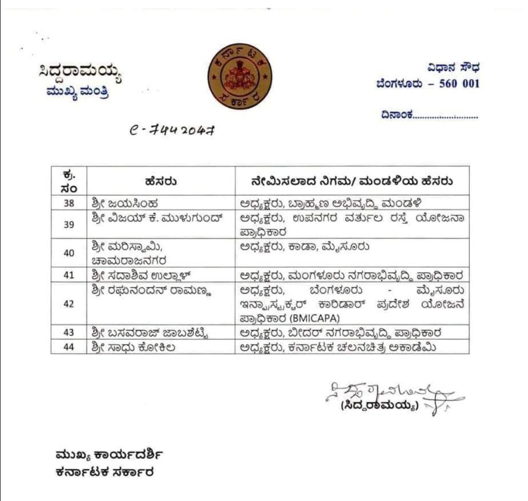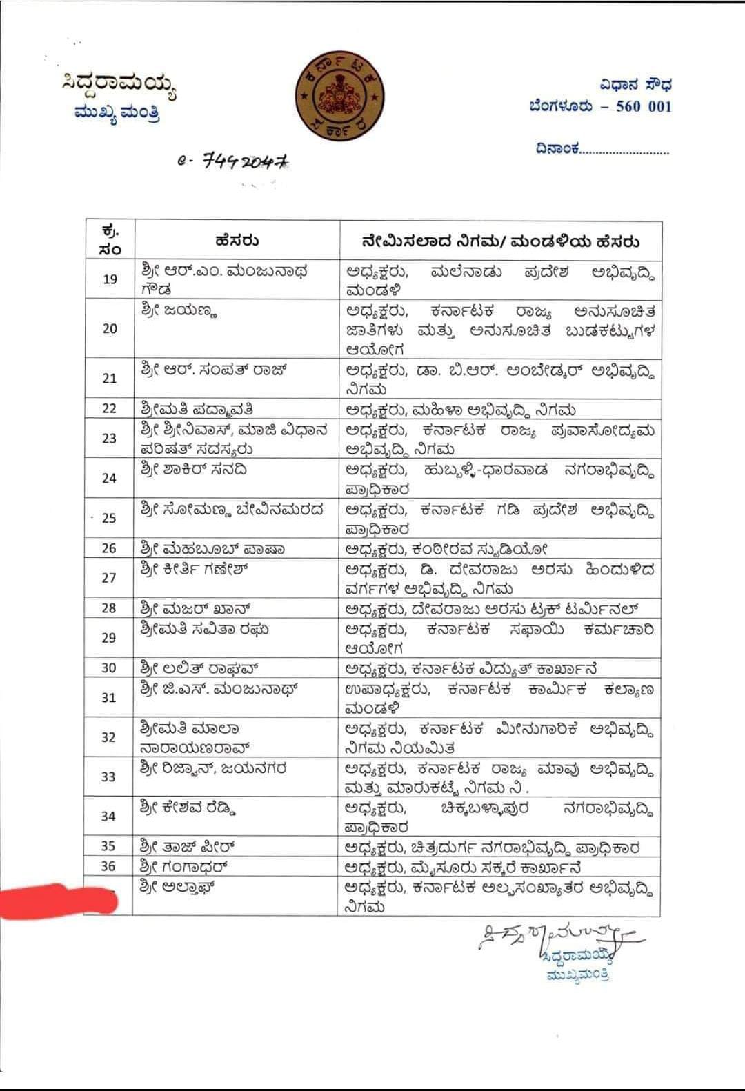 ನೂತನವಾಗಿ ನಿಗಮ ಮಂಡಳಿ ಅಧ್ಯಕ್ಷರ ಪಟ್ಟಿ ಈ ಕೆಳಗಿನಂತಿದೆ.