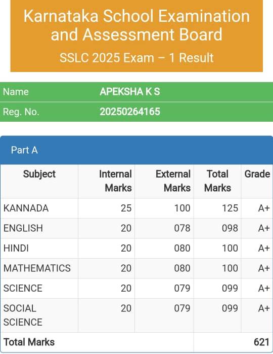 ಮೂಡಿಗೆರೆ ತಾಲ್ಲೂಕು ಕುನ್ನಹಳ್ಳಿ ಗ್ರಾಮದ ಕೃಷಿಕರು ಮತ್ತು ಹಳೇಮೂಡಿಗೆರೆ ಗ್ರಾಮ ಪಂಚಾಯಿತಿ ಸದಸ್ಯ ಕೆ.ಆರ್. ಶಿವಾನಂದ, ಶ್ರೀಮತಿ ಚಾಂದಿನಿ ಅವರ ಪುತ್ರಿ ಮೂಡಿಗೆರೆ ಬೆಥನಿ ಶಾಲೆ ವಿದ್ಯಾರ್ಥಿನಿ ಕೆ.ಎಸ್. ಅಪೇಕ್ಷಾ 625 ಕ್ಕೆ 621 ಅಂಕಗಳನ್ನು ಗಳಿಸಿದ್ದಾರೆ. ಮಗಳ ಸಾಧನೆಗೆ ಪೋಷಕರು ಸಂತಸ ವ್ಯಕ್ತಪಡಿಸಿದ್ದಾರೆ.