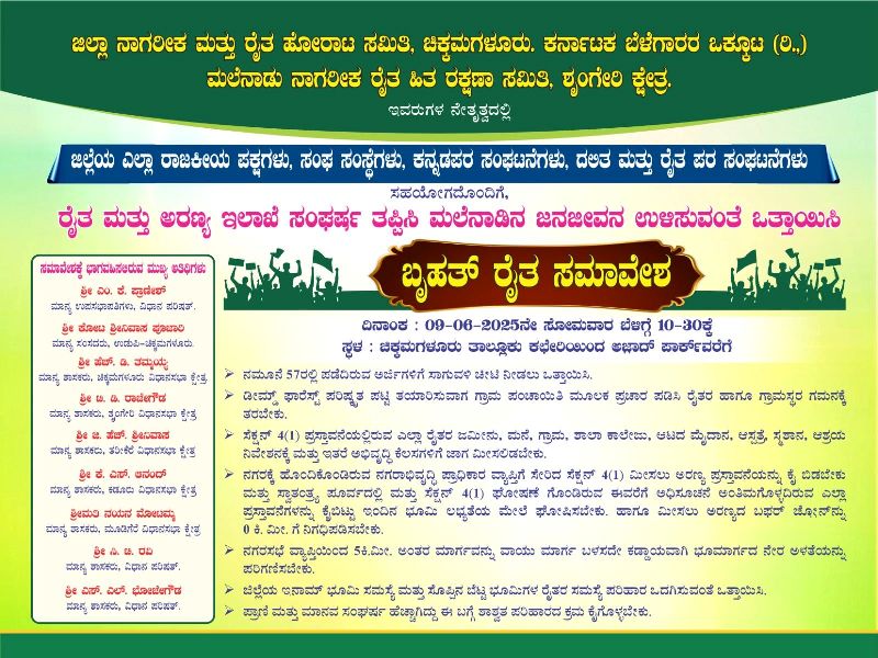 ಇದು ಮಲೆನಾಡಿನ ಸ್ವಾಭಿಮಾನಿ ರೈತ ಬೆಳೆಗಾರರ ಅಸ್ತಿತ್ವದ ಪ್ರಶ್ನೆಯಾಗಿದೆ. ಈ ಸಮಸ್ಯೆಗಳನ್ನು ಸಮರ್ಥವಾಗಿ ಎದುರಿಸಲು ಕಾಫಿನಾಡಿನ ಜನರು ಒಮ್ಮನಸ್ಸಿನಿಂದ ನಮ್ಮದೇ ಬದುಕಿನ ಉಳಿವಿಗಾಗಿ ಈ ರೈತ ಸಮಾವೇಶದಲ್ಲಿ ಅತೀ ಹೆಚ್ಚು ಸಂಖ್ಯೆಯಲ್ಲಿ ಪಾಲ್ಗೊಳ್ಳಬೇಕೆಂದು ಮೂಡಿಗೆರೆ ಬೆಳೆಗಾರರ ಸಂಘದ ಪರವಾಗಿ ಅಧ್ಯಕ್ಷ ಬಿ.ಆರ್.ಬಾಲಕೃಷ್ಣ, ಕಾರ್ಯದರ್ಶಿ ಮನೋಹರ್ ಮತ್ತು ಪದಾಧಿಕಾರಿಗಳು ಮನವಿ ಮಾಡಿದ್ದಾರೆ.