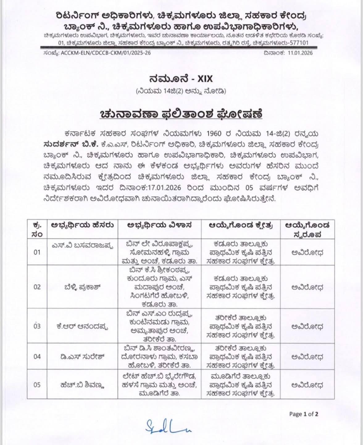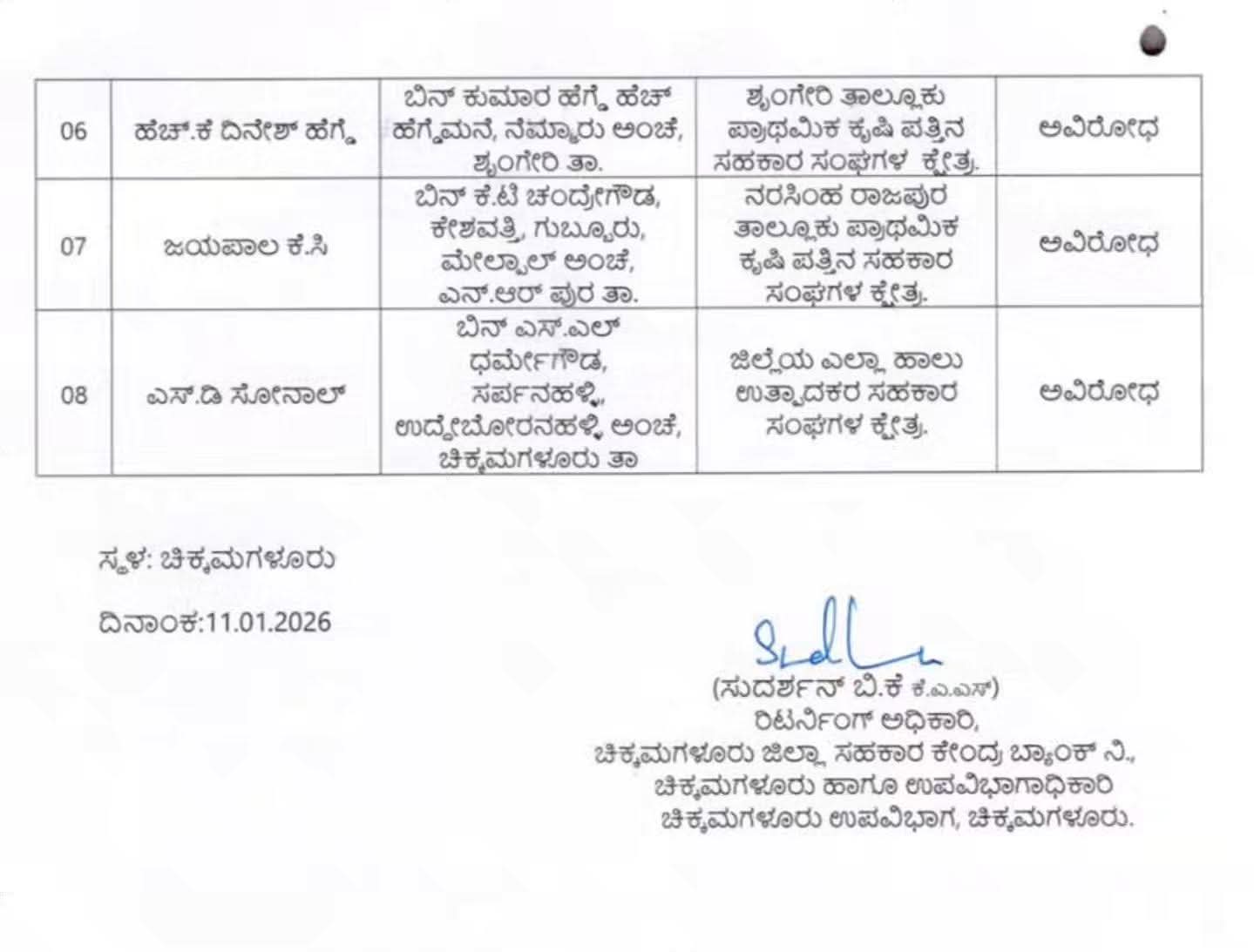 ಕಡೂರು ಪ್ರಾಥಮಿಕ ಕೃಷಿ ಪತ್ತಿನ ಸಹಕಾರ ಸಂಘಗಳಿಂದ ಬೆಳ್ಳಿಪ್ರಕಾಶ್ ಮತ್ತು ಎಸ್.ವಿ. ಬಸವರಾಜಪ್ಪ, ತರೀಕೆರೆ ಪ್ರಾಥಮಿಕ ಕೃಷಿ ಪತ್ತಿನ ಸಹಕಾರ ಸಂಘಗಳಿಂದ ಡಿ.ಎಸ್. ಸುರೇಶ್ ಮತ್ತು ಕೆ.ಆರ್.ಆನಂದಪ್ಪ ಮೂಡಿಗೆರೆ ಪ್ರಾಥಮಿಕ ಕೃಷಿ ಪತ್ತಿನ ಸಹಕಾರ ಸಂಘಗಳಿಂದ ಹೆಚ್.ಬಿ. ಶಿವಣ್ಣ ಹಳಸೆ, ಶೃಂಗೇರಿ ಪ್ರಾಥಮಿಕ ಕೃಷಿ ಪತ್ತಿನ ಸಹಕಾರ ಸಂಘಗಳಿಂದ ಹೆಚ್.ಕೆ. ದಿನೇಶ್ ಹೆಗ್ಡೆ, ಎನ್.ಆರ್.ಪುರ ಪ್ರಾಥಮಿಕ ಕೃಷಿ ಪತ್ತಿನ ಸಹಕಾರ ಸಂಘಗಳಿಂದ ಜಯಪಾಲ್ ಕೆ.ಸಿ., ಜಿಲ್ಲೆಯ ಹಾಲು ಉತ್ಪಾದಕರ ಸಹಕಾರ ಸಂಘ ಕ್ಷೇತ್ರದಿಂದ ಸೋನಾಲ್ ಅವಿರೋಧವಾಗಿ ಆಯ್ಕೆಯಾಗಿದ್ದಾರೆ.