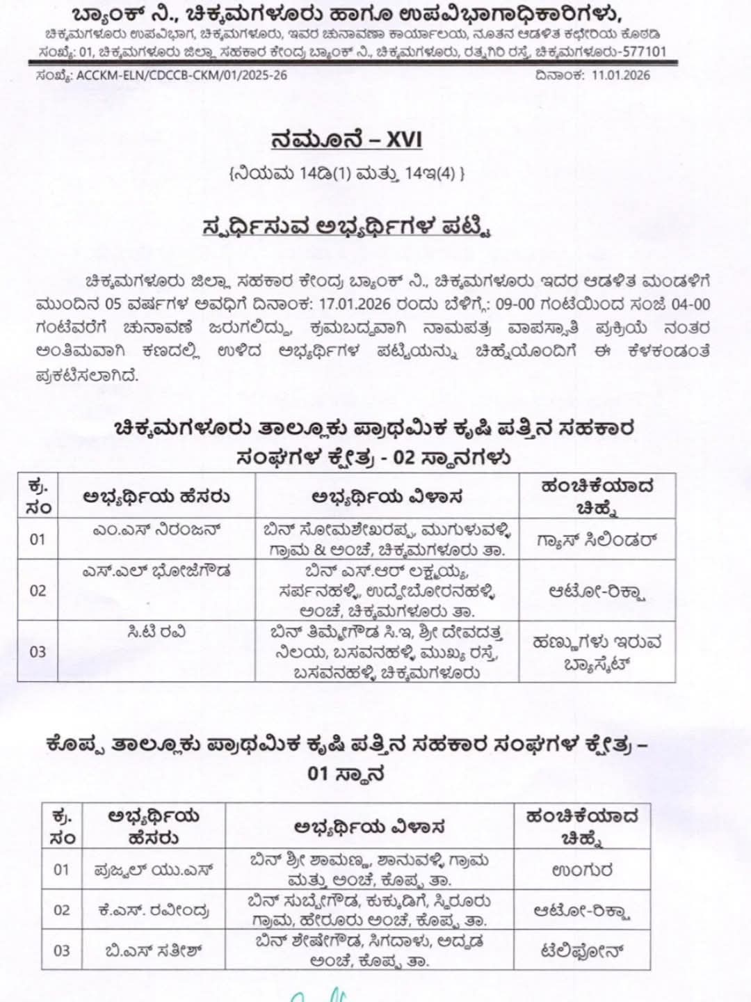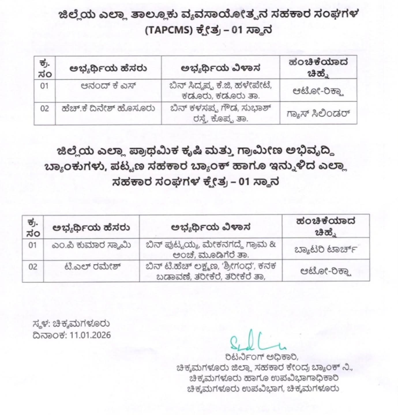 ಇನ್ನು ಚಿಕ್ಕಮಗಳೂರು ತಾಲ್ಲೂಕು ಪ್ರಾಥಮಿಕ ಕೃಷಿ ಪತ್ತಿನ ಸಹಕಾರ ಸಂಘಗಳ ಕ್ಷೇತ್ರದ 2 ಸ್ಥಾನಗಳಿಗೆ ಸಿ.ಟಿ.ರವಿ, ಎಸ್.ಎಲ್. ಬೋಜೇಗೌಡ ಮತ್ತು ಎಂ.ಎಸ್. ನಿರಂಜನ್ ಕಣದಲ್ಲಿದ್ದಾರೆ. ಕೊಪ್ಪ ತಾಲ್ಲೂಕು ಪ್ರಾಥಮಿಕ ಕೃಷಿ ಪತ್ತಿನ ಸಹಕಾರ ಸಂಘಗಳ ಕ್ಷೇತ್ರದ 1 ಸ್ಥಾನಕ್ಕೆ ಕೆ.ಎಸ್.ರವೀಂದ್ರ, ಪ್ರಜ್ವಲ್, ಬಿಎಸ್ ಸತೀಶ್ ಕಣದಲ್ಲಿದ್ದಾರೆ. ಜಿಲ್ಲೆಯ ಎಲ್ಲಾ ಟಿಎಪಿಸಿಎಂಎಸ್ ಕ್ಷೇತ್ರಗಳಿಂದ 1 ಸ್ಥಾನಕ್ಕೆ ಆನಂದ್ ಕೆ.ಎಸ್. ಮತ್ತು ದಿನೇಶ್ ಹೊಸೂರು ಕಣದಲ್ಲಿದ್ದಾರೆ. ಜಿಲ್ಲೆಯ ಎಲ್ಲಾ ಪ್ರಾಥಮಿಕ ಸಹಕಾರ ಮತ್ತು ಗ್ರಾಮೀಣ ಅಭಿವೃದ್ಧಿ ಬ್ಯಾಂಕ್ ಮತ್ತು ಪಟ್ಟಣ ಸಹಕಾರ ಹಾಗೂ ಇನ್ನಿತರೆ ಎಲ್ಲಾ ಸಹಕಾರ ಕ್ಷೇತ್ರದ 1 ಸ್ಥಾನಕ್ಕೆ ಮೂಡಿಗೆರೆ ಮಾಜಿ ಶಾಸಕ ಎಂ.ಪಿ.ಕುಮಾರಸ್ವಾಮಿ ಮತ್ತು ತರೀಕೆರೆ ಟಿ.ಎಲ್. ರಮೇಶ್ ಕಣದಲ್ಲಿದ್ದಾರೆ.
