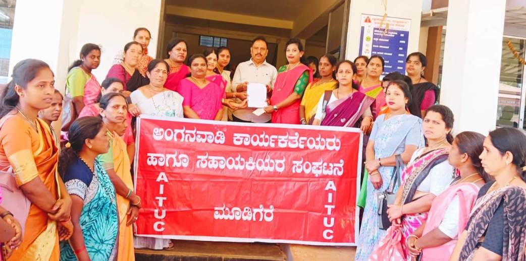 ಅವರು ಗುರುವಾರ ಎಐಟಿಯುಸಿ ಅಂಗನವಾಡಿ ಕಾರ್ಯಕರ್ತೆಯರು ಹಾಗೂ ಸಹಾಯಕಿಯರ ಸಂಘಟನೆಯಿಂದ ತಾಲೂಕು ಕಚೇರಿ ಎದುರು ನಡೆಸಿದ ಪ್ರತಿಭಟನೆಯಲ್ಲಿ ಮಾತನಾಡಿದರು.