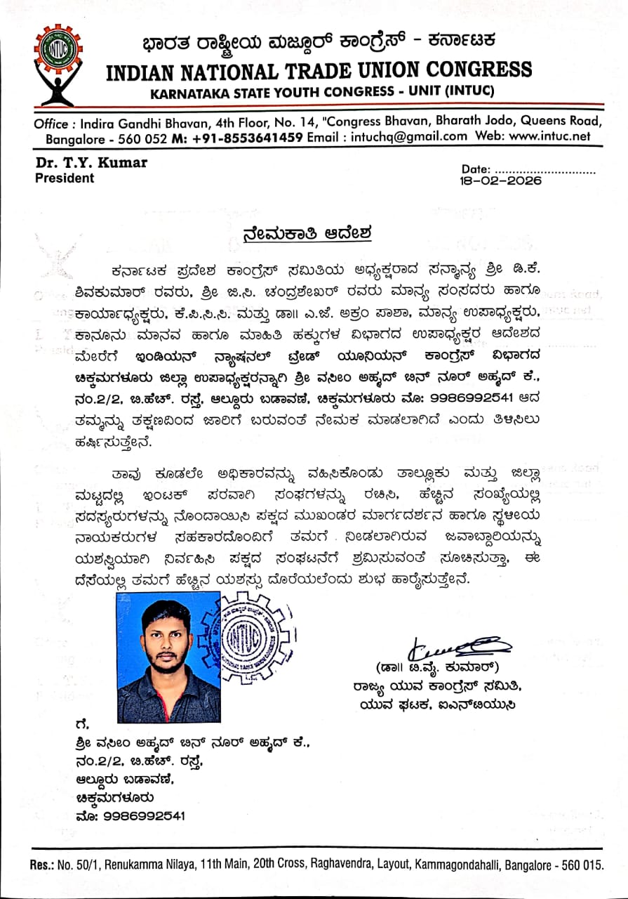 ಕರ್ನಾಟಕ ಪ್ರದೇಶ ಕಾಂಗ್ರೇಸ್ ಅಧ್ಯಕ್ಷ ಡಿಕೆ ಶಿವಕುಮಾರ್ ಮತ್ತು ಕೆಪಿಸಿಸಿ ಕಾರ್ಯಾಧ್ಯಕ್ಷ ಸಂಸದ ಬಿಸಿ, ಚಂದ್ರಶೇಖರ್, ಮತ್ತು ಕಾನೂನು ಮಾನವ ಹಾಗೂ ಮಾಹಿತಿ ಹಕ್ಕುಗಳ ವಿಭಾಗದ ಉಪಾಧ್ಯಕ್ಷರಾದ ಡಾlllಎಜೆ, ಅಕ್ರಂಪಾಶ, ಆದೇಶದ ಮೇರೆಗೆ ವಸೀಮ್ ಅಹ್ಮದ್ ಅವರನ್ನು ಇಂಡಿಯನ್ ನ್ಯಾಷನಲ್ ಟ್ರೇಡ್ ಯೂನಿಯನ್ ಕಾಂಗ್ರೆಸ್ ವಿಭಾಗದ ಜಿಲ್ಲಾ ಉಪಾಧ್ಯಕ್ಷರನ್ನಾಗಿ ಆಯ್ಕೆ ಮಾಡಿ ಆದೇಶಿಸಲಾಗಿದೆ ಎಂದು ರಾಜ್ಯ ಯುವ ಕಾಂಗ್ರೆಸ್ ಸಮಿತಿ ಯುವ ಘಟಕ ಐಎನ್ ಟಿಯುಸಿ ರಾಜ್ಯದ್ಯಕ್ಷ ಡಾlll.ಟಿ.ವೈ. ಕುಮಾರ್, ಪ್ರಕಟಣೆಯಲ್ಲಿ ತಿಳಿಸಿದ್ದಾರೆ.