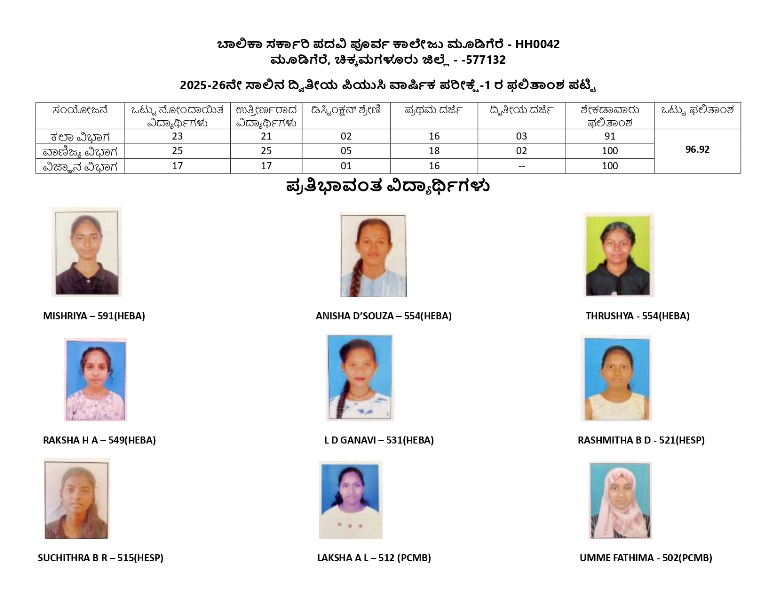 ಮೂಡಿಗೆರೆ ಪಟ್ಟಣದ ಬಾಲಿಕಾ ಸರಕಾರಿ ಪದವಿ ಪೂರ್ವ ಕಾಲೇಜಿನ ವಿದ್ಯಾರ್ಥಿನಿ ಮಿಸ್ರಿಯಾ ದ್ವಿತೀಯ ಪಿಯುಸಿ ವಾಣಿಜ್ಯ ವಿಭಾಗದಲ್ಲಿ 591 ಅಂಕ ಗಳಿಸಿ ಶೇ.98.50 ಫಲಿತಾಂಶ ಪಡೆದಿದ್ದಾರೆ.