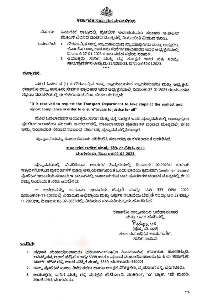 ಸಂಚಾರಿ ನಿಯಮ ಉಲ್ಲಂಘಿಸಿ ಕೇಸು ದಾಖಲಾಗಿ ನ್ಯಾಯಾಲಯದಲ್ಲಿ ದಂಡ ಕಟ್ಟಲು ಬಾಕಿ ಇರುವವರಿಗೆ ದಂಡ ಮೊತ್ತದ ಶೇಕಡಾ 50ರಷ್ಟು ರಿಯಾಯಿತಿಯನ್ನು ರಾಜ್ಯ ಸರ್ಕಾರ ಘೋಷಣೆ ಮಾಡಿದೆ.